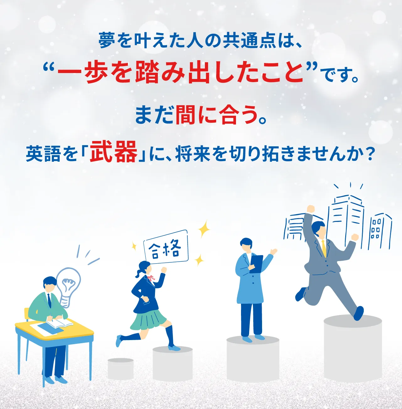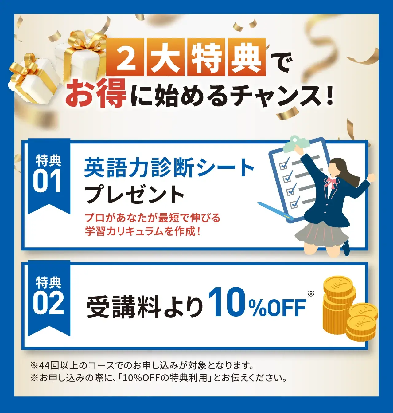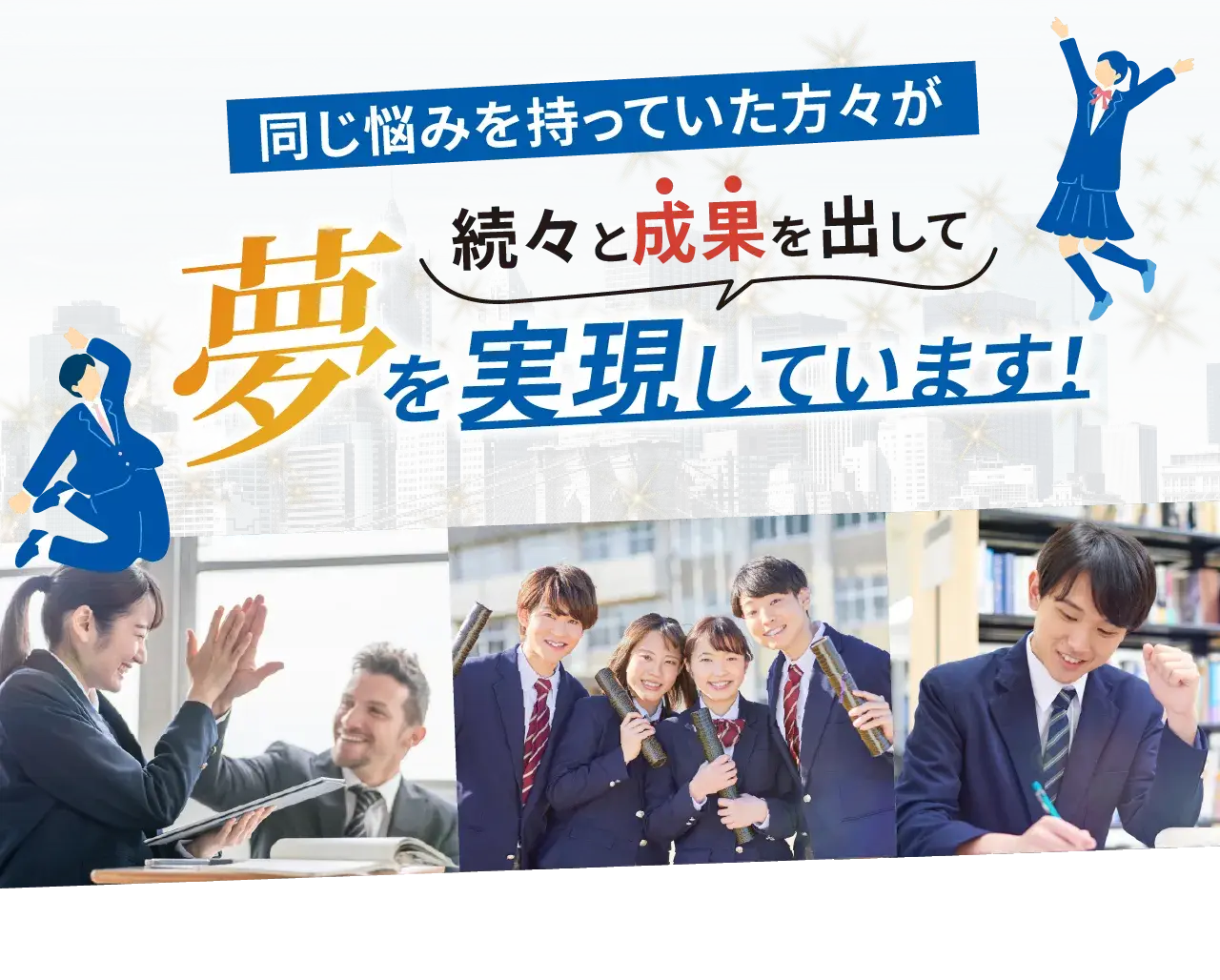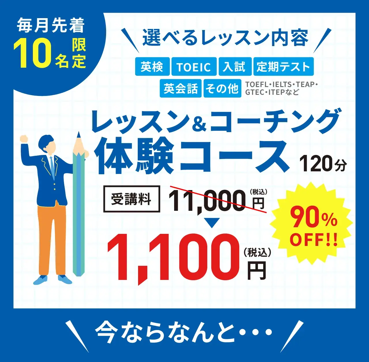 小学5年生で英検2級合格(高校卒業レベル)、TOEIC3ヶ月で305点UP、共通テストの点数を2倍にするなど、多数の実績があります。 それ以外にも、留学や入試などたくさんの受講生に目標達成していただいております。 さらに、万が一合わないと感じた際には、30日寛の全額返金保証制度もご用意しています。