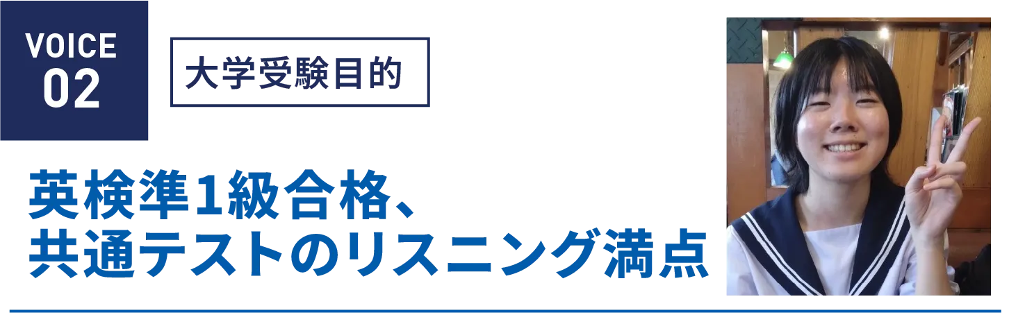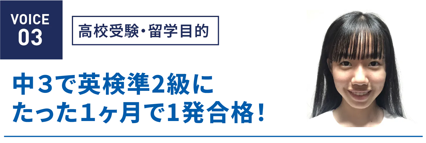 小学校の授業で英語に触れた程度の初心者でしたが、高校1年生までに英検準1級を取得するという目標を立て、英検対策のレッスンをお願いしました。英検は一つの目標としてで、大学受験も見据え、基礎からしっかり固めたいとお伝えしたら、意向に沿って学習計画を立ててくださいました。現在中学2年生、中1で英検4級、3級を取得し、今は準2級も合格して、2級に挑戦中です。